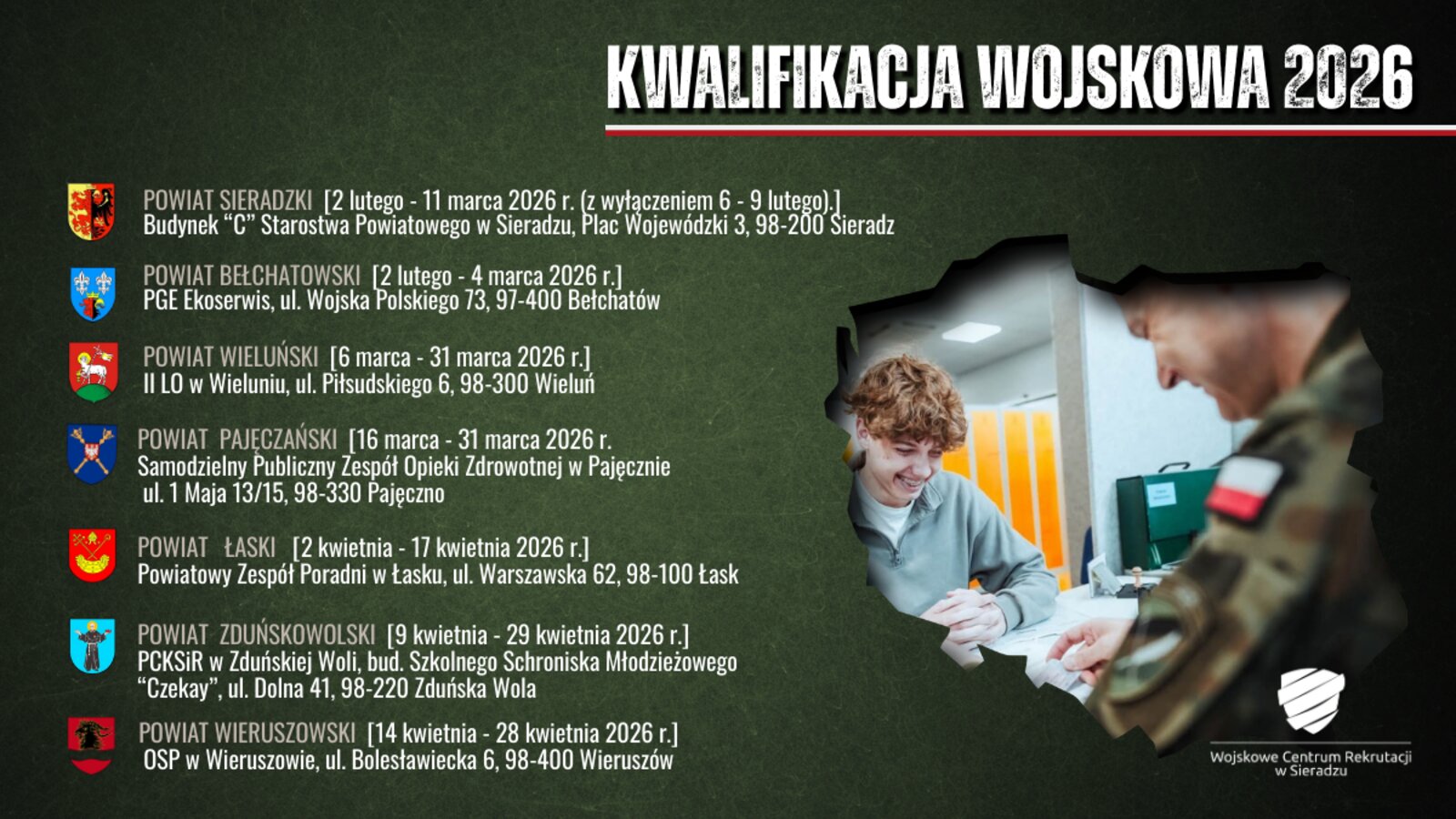 Na terenie administrowanym przez Wojskowe Centrum Rekrutacji w Sieradzu Powiatowe Komisje Lekarskie będą pracować w następujących terminach: