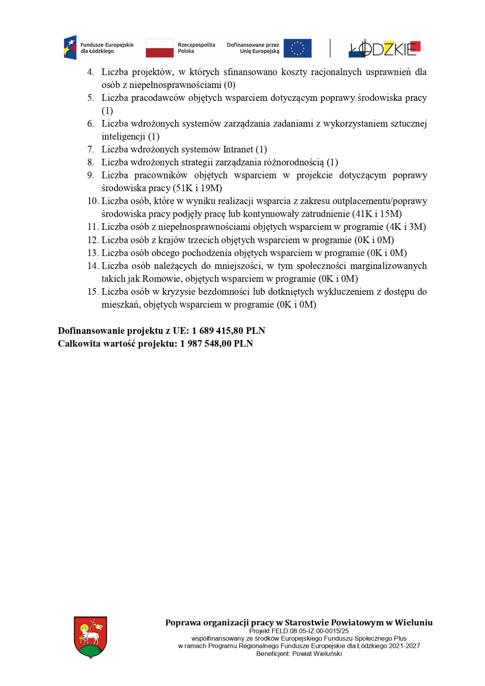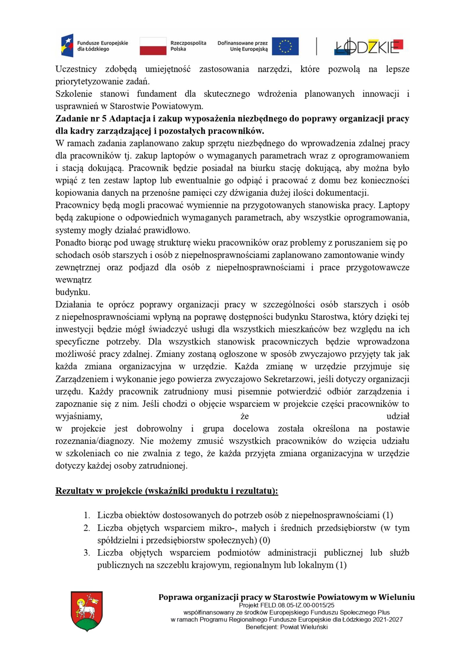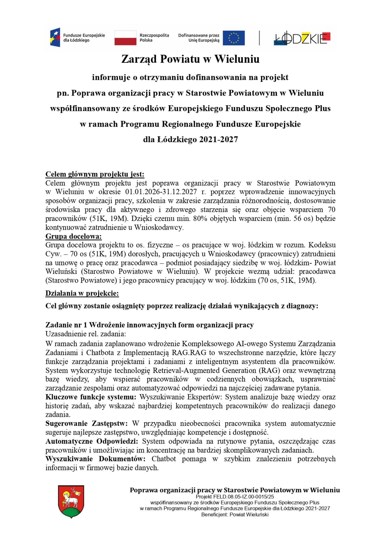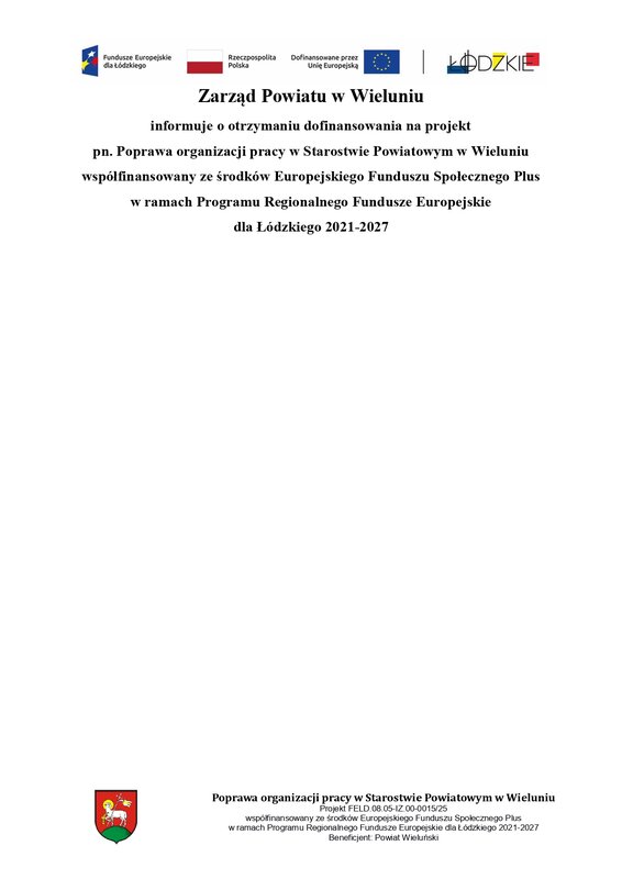 Zarząd Powiatu w Wieluniu informuje o otrzymaniu dofinansowania na projekt pn. Poprawa organizacji pracy w Starostwie Powiatowym w Wieluniu współfinansowany ze środków Europejskiego Funduszu Społecznego Plus w ramach Programu Regionalnego Fundusze Europejskie dla Łódzkiego 2021-2027.