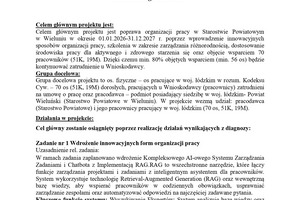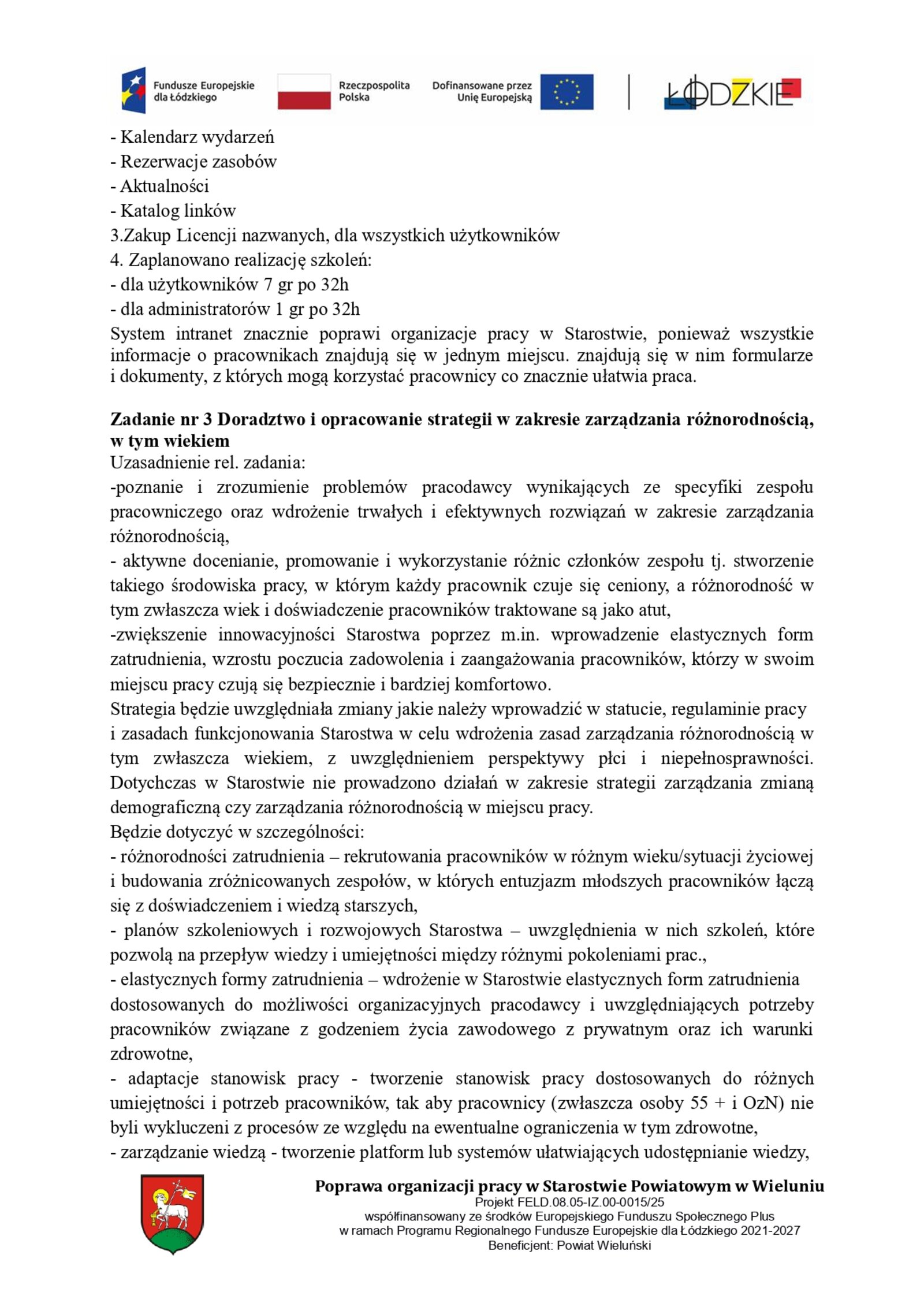 Celem głównym projektu jest poprawa organizacji pracy w Starostwie Powiatowym w Wieluniu w okresie 01.01.2026-31.12.2027 r. poprzez wprowadzenie innowacyjnych sposobów organizacji pracy, szkolenia w zakresie zarządzania różnorodnością, dostosowanie środowiska pracy dla aktywnego i zdrowego starzenia się oraz objęcie wsparciem 70 pracowników (51K, 19M). Dzięki czemu min. 80% objętych wsparciem (min. 56 os) będzie kontynuować zatrudnienie u Wnioskodawcy.